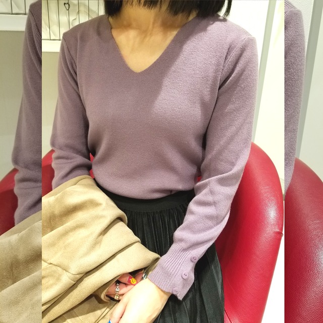 サイズ 着丈:54cm バスト:45cm 肩幅:34cm 袖丈:58cm キーネックになった万能インナー。 袖にはポイントとなるボタンが。 デコルテがキレイに見える薄手ニットです。