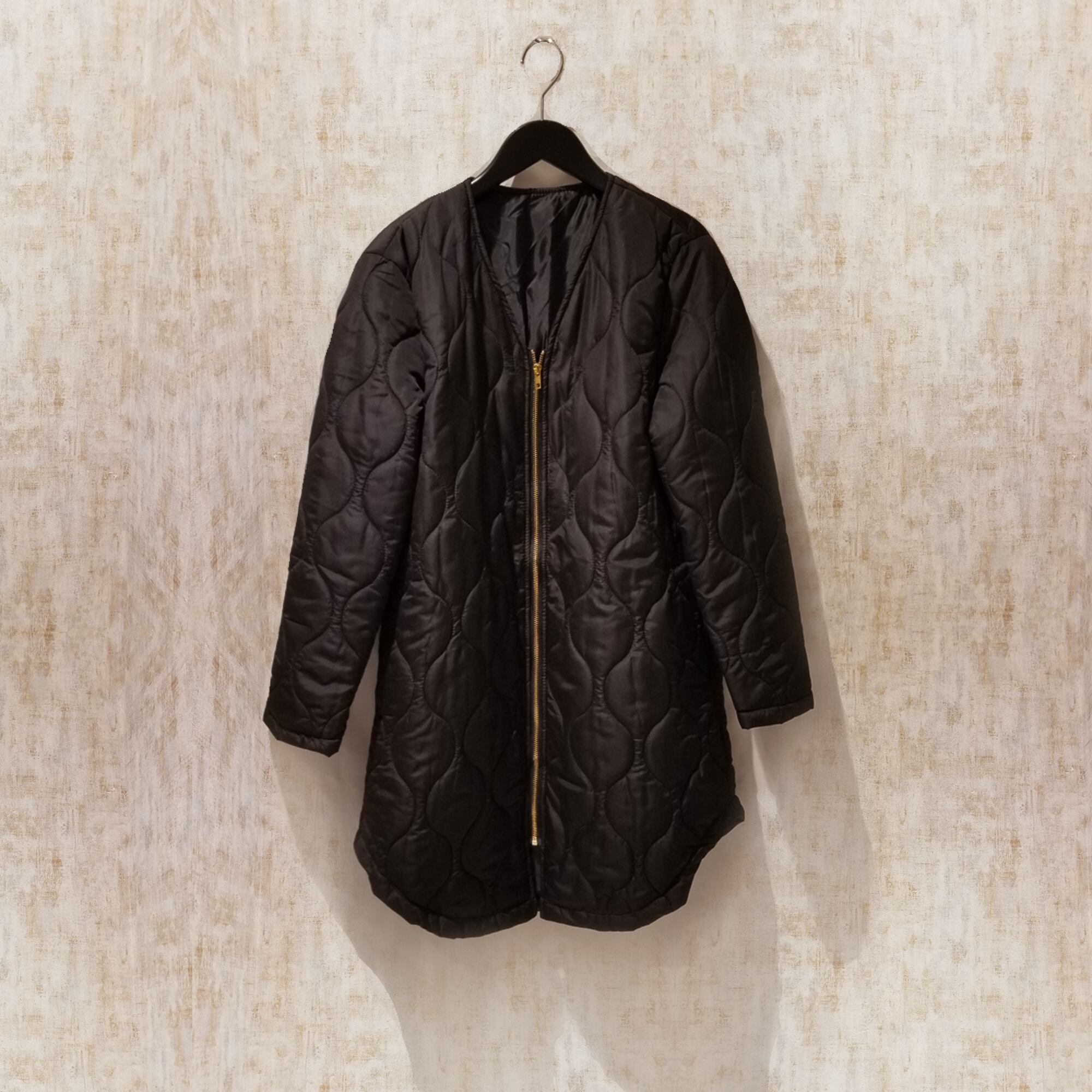 どんなコーディネートにも合わせやすいベーシックなデザインのキルティングコート。